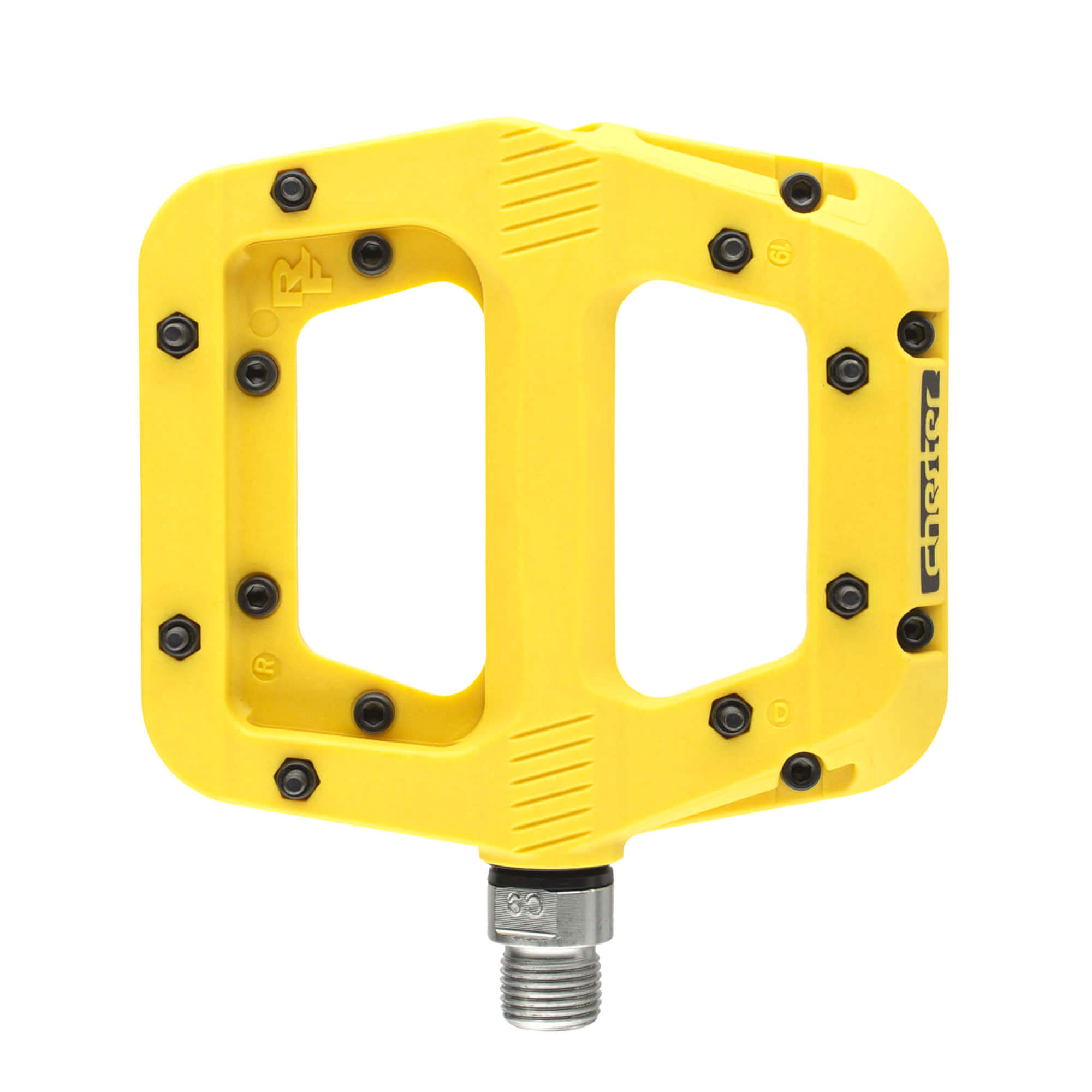 A new edition to the Race Face pedal line-up: the Chester Pedal. The tough and burly nylon composite body provides a large platform with the same grip as traditional alloy pedals via the bottom loading 8 hex traction pins per side. Thin and lightweight is the name of the game with the Chester, featuring a cro-mo axle that is fully sealed and a 100% serviceable bearing and bushing system. This pedal offers great performance for a wide range of riders at a price that leaves plenty of cash in your pocket for that round of bevies at your local watering hole after hammering out a day of hot laps with the crew.